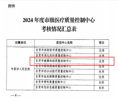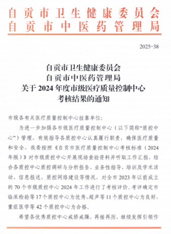 自贡市健康体检医疗质量控制中心作为全市体检行业的质量监管与技术指导机构,始终秉承"质量立本规范先行"的工作理念,持续引领全市的健康体检质量管理工作。2024年度中心工作再次获评全市优秀。